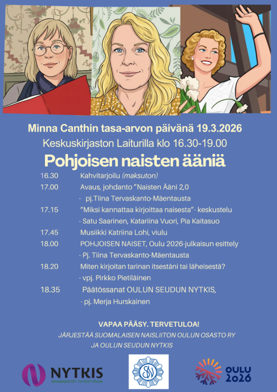 Minna Canthin päivänä 19.3.2026 Oulun keskuskirjasto Saaren Laiturilla klo 16.30-19.00